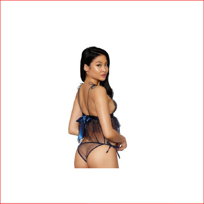 Prepare to shine like a star with the glitter mesh fabric that adorns this captivating babydoll and panty set. The sheer sparkling triangle cups, embellished with delightful ruffles, showcase your curves with a touch of glamour and allure.
