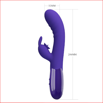 This smooth silicone vibe with 30 function rabbit vibrator is amazingly equipped to provide you with intense pleasure night after night. The shape of this sleek and stylish toy is smooth and curved with a thick head to reach your inner G-spot and a smaller curved rabbit licking clit stim to ensure fist clenching orgasms.