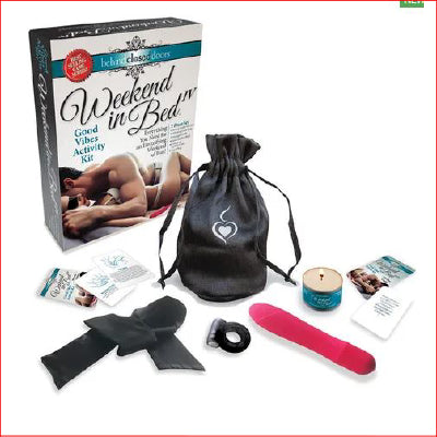 Weekend in Bed Good Vibes Activity Kit is everything you need for an electrifying weekend of fun. This seven piece set includes a silicone bullet vibrator, a vibration cock ring, massage candle satin tie/blindfold 2 decks of activity cards in a convenient travel bag.